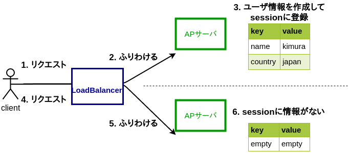 セッションはAPサーバ固有のデータ保存領域のため、APサーバが複数台あると、ロードバランサのふりわけによってはセッション情報が参照できなくなる可能性がある。