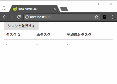 - 「タスクを登録する」ボタンを押すと、サーバ側でDBに0-10件のランダムなタスクを登録する。