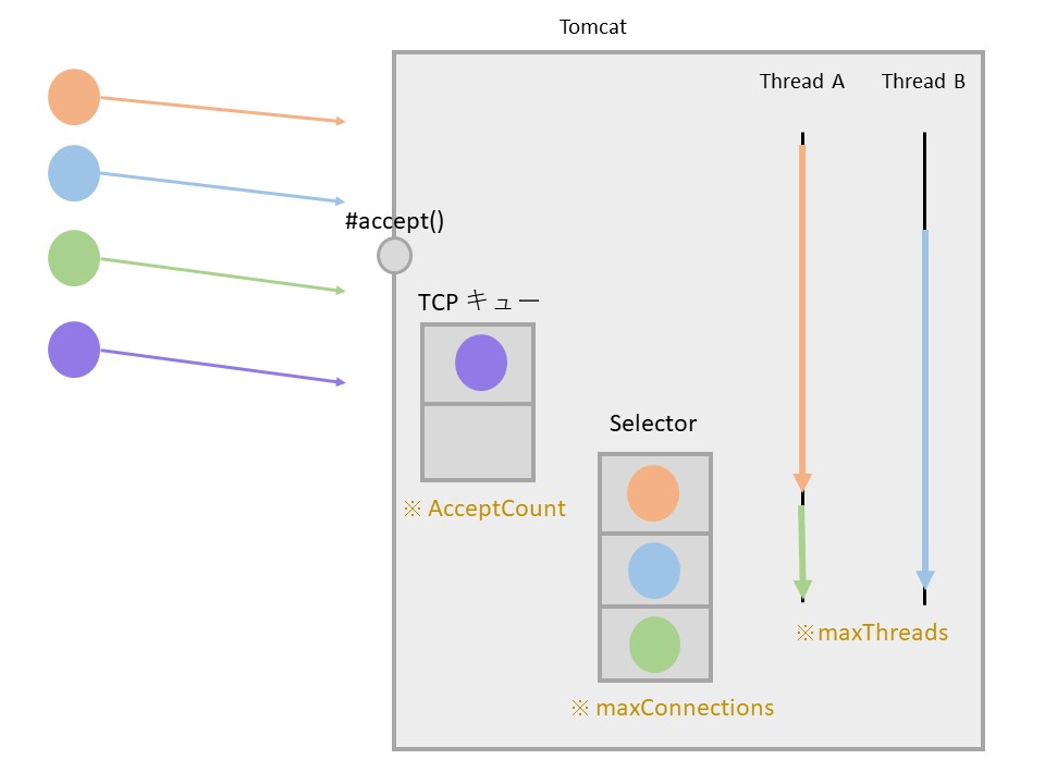maxConnectionsを超えたリクエストが来た場合、Acceptorスレッドを止めて待つ