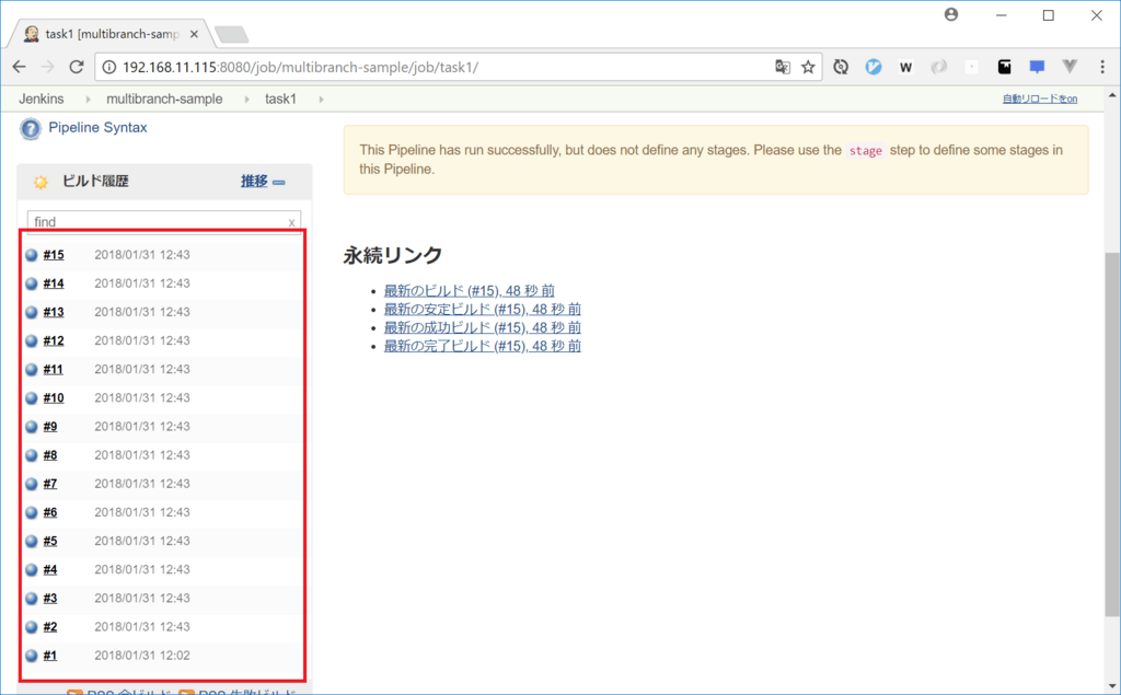 このとき、デフォルトだと、各ブランチごとの成果物の保存数は上限がない。 そのため、成果物がどんどん溜まってしまい、ディスクフルを起こす可能性がある。
