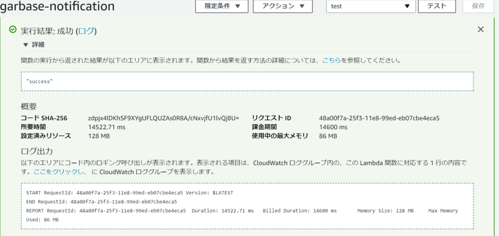 無料枠内で使える時間は、利用するメモリに依存するらしく、128MBであれば 3,200,000s が目安になる。ということは 3,200,000s / 15s = 213333 回は実行できるので、当分はお金面の心配はなさそう。