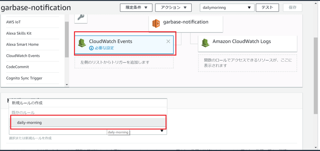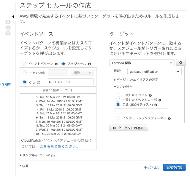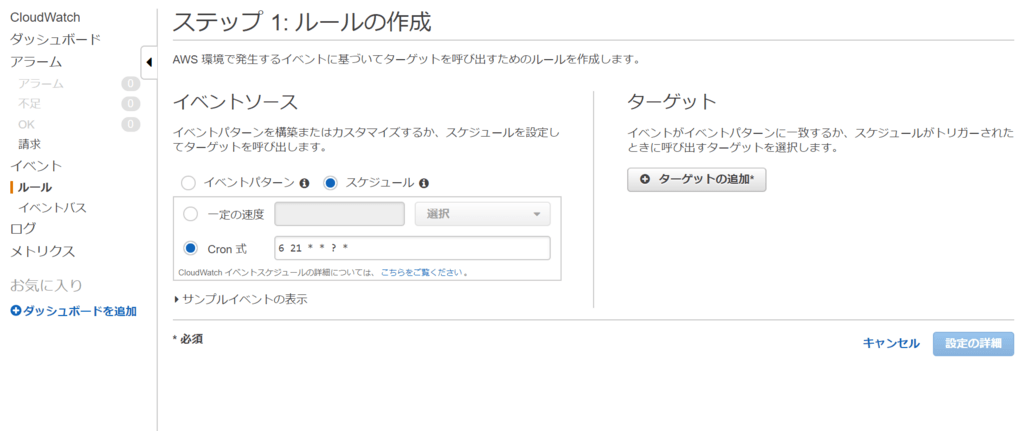 CloudWatchサービスに移動し、時刻起動のイベントを作成する。