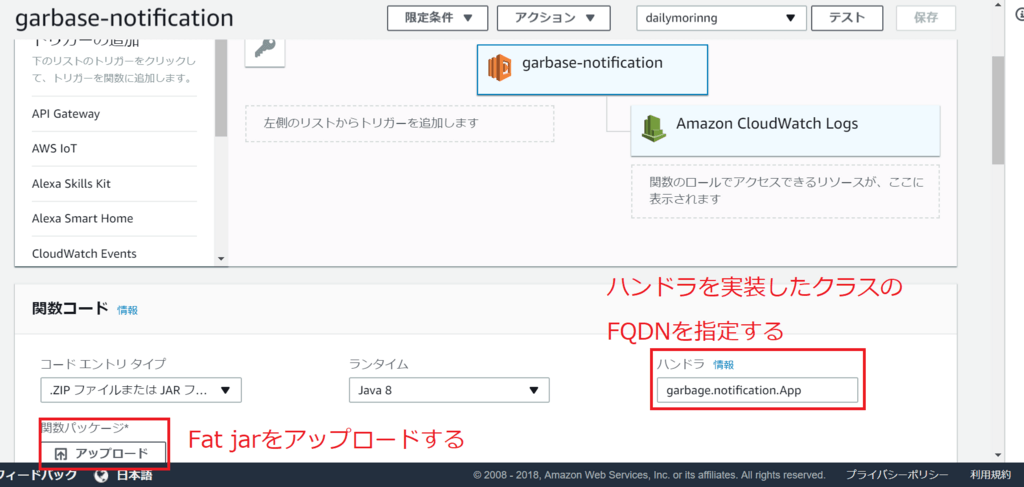 AWSの公式では maven-shade-plugin が例に挙げられているけど maven-assembly-plugin でも動いた。classファイルがすべて含まれた fat jar 形式であることが重要なんでしょう。たぶん。