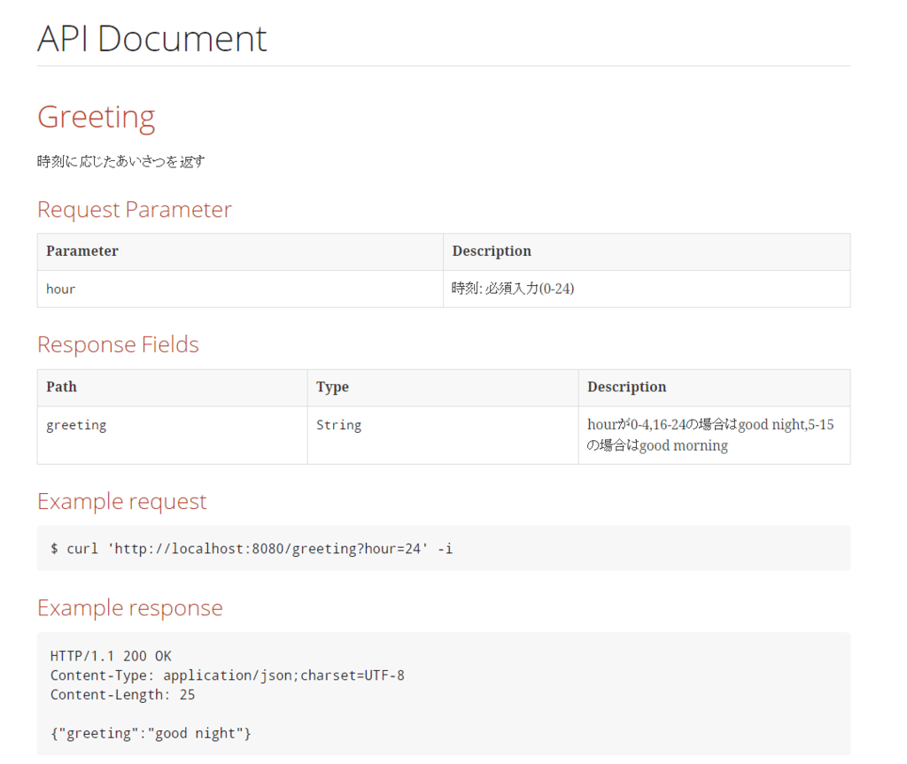 Spring REST Docsを利用すれば、テストコードから以下のようなAPIドキュメントを作成できるようになる。