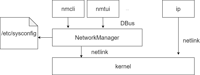 nmcli は DBus(プロセス間通信の仕組み) 経由で NetworkManager と通信し、ネットワークを操作する CLI ツール。 NetworkManager を利用したツールは nmcli のほかに、 nmtui や GUI などがある。